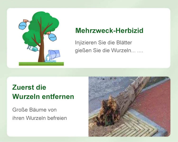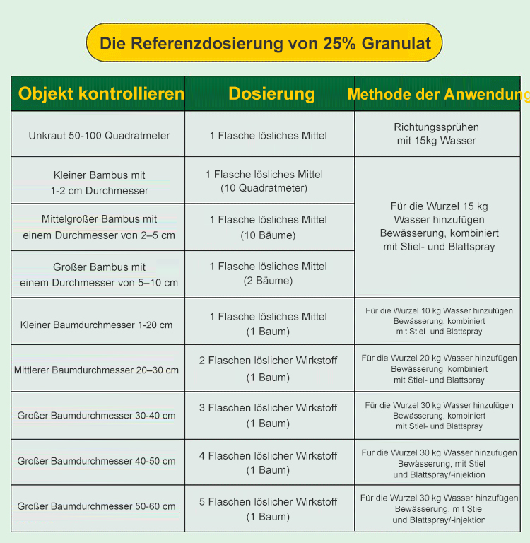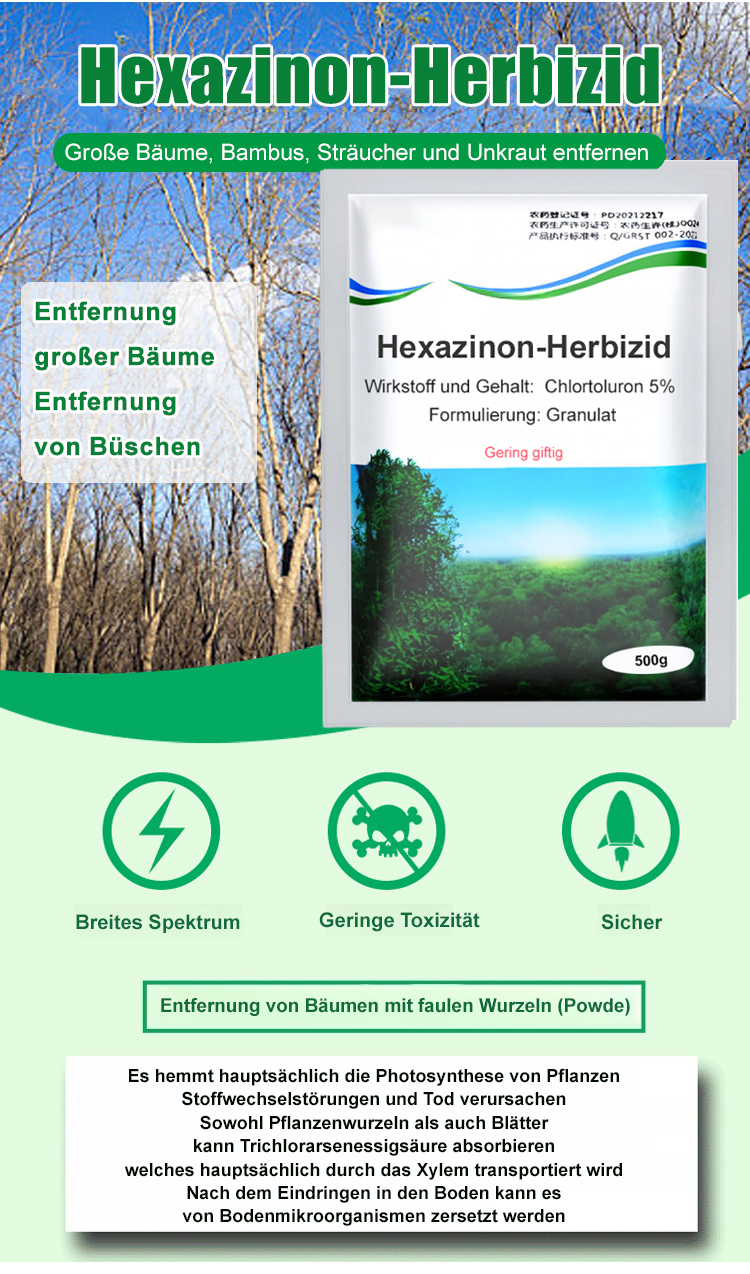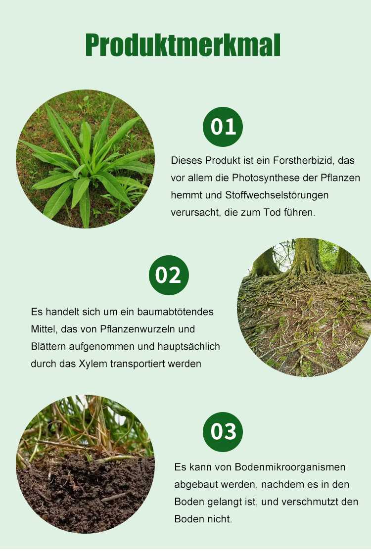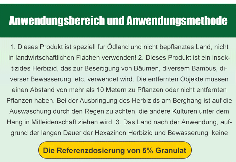 Es kann problemlos alle Arten von Unkraut, Sträuchern, Bambus und großen Bäumen abtöten. Sie müssen kein Wasser hinzufügen, sondern können es einfach direkt auf dem Boden verteilen. Es ist ganzjährig einsetzbar und eine Packung reicht für 500 Quadratmeter.