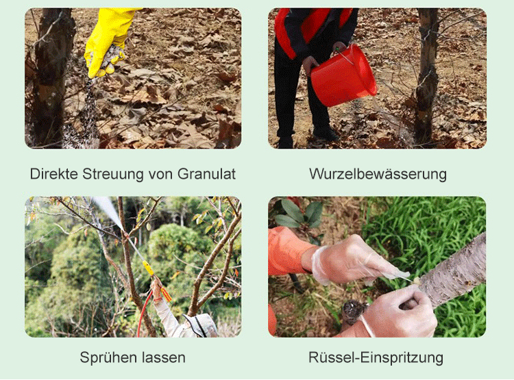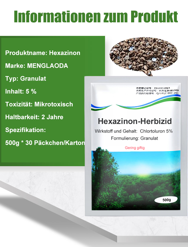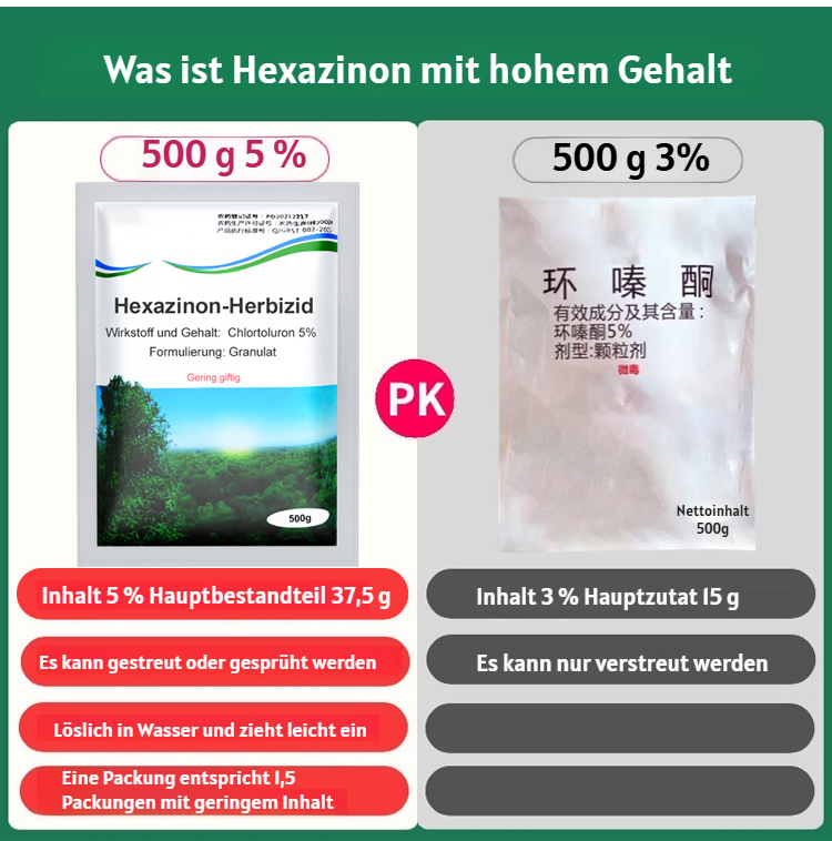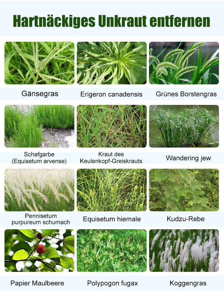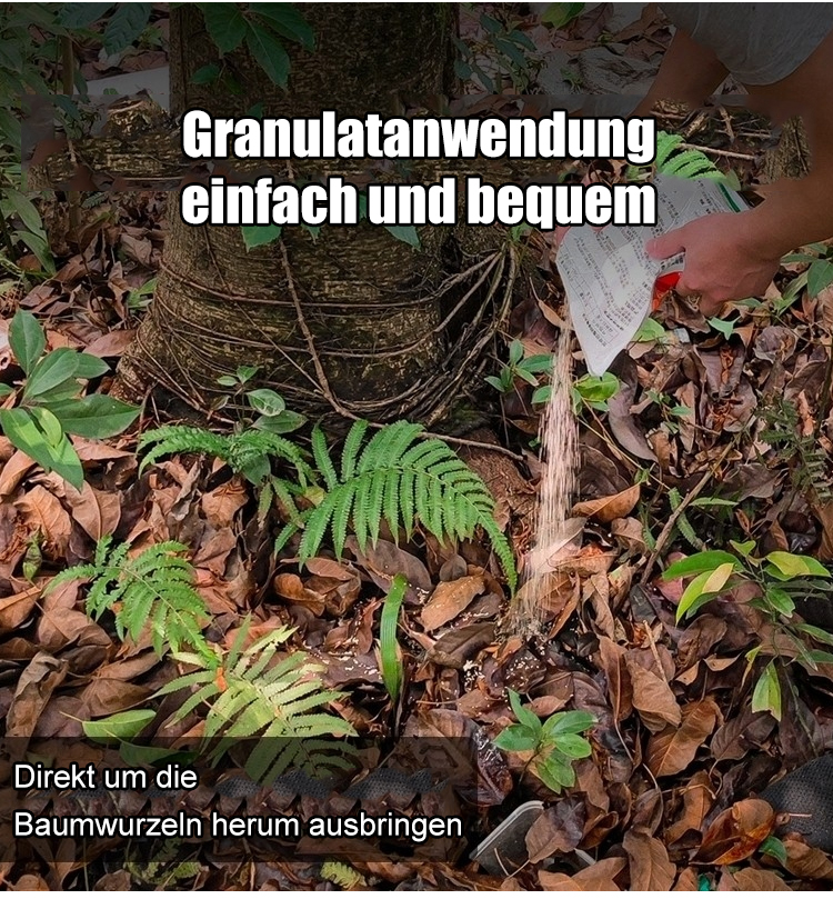 Es kann problemlos alle Arten von Unkraut, Sträuchern, Bambus und großen Bäumen abtöten. Sie müssen kein Wasser hinzufügen, sondern können es einfach direkt auf dem Boden verteilen. Es ist ganzjährig einsetzbar und eine Packung reicht für 500 Quadratmeter.