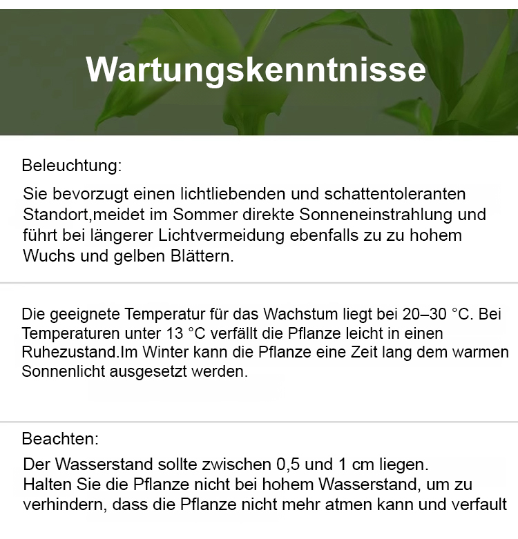 Sie benötigt kein Sonnenlicht, kommt allein mit Wasser aus und bleibt das ganze Jahr über grün. Ihre Blätter verströmen ein einzigartiges Aroma, das den Geist beruhigt und die Schlafqualität verbessert. Während der Blüte erfüllt sie das ganze Haus mit dem Duft eines hochwertigen Parfüms. Der Vorrat ist begrenzt, daher bitten wir Sie, Ihre Bestellung so schnell wie möglich aufzugeben.